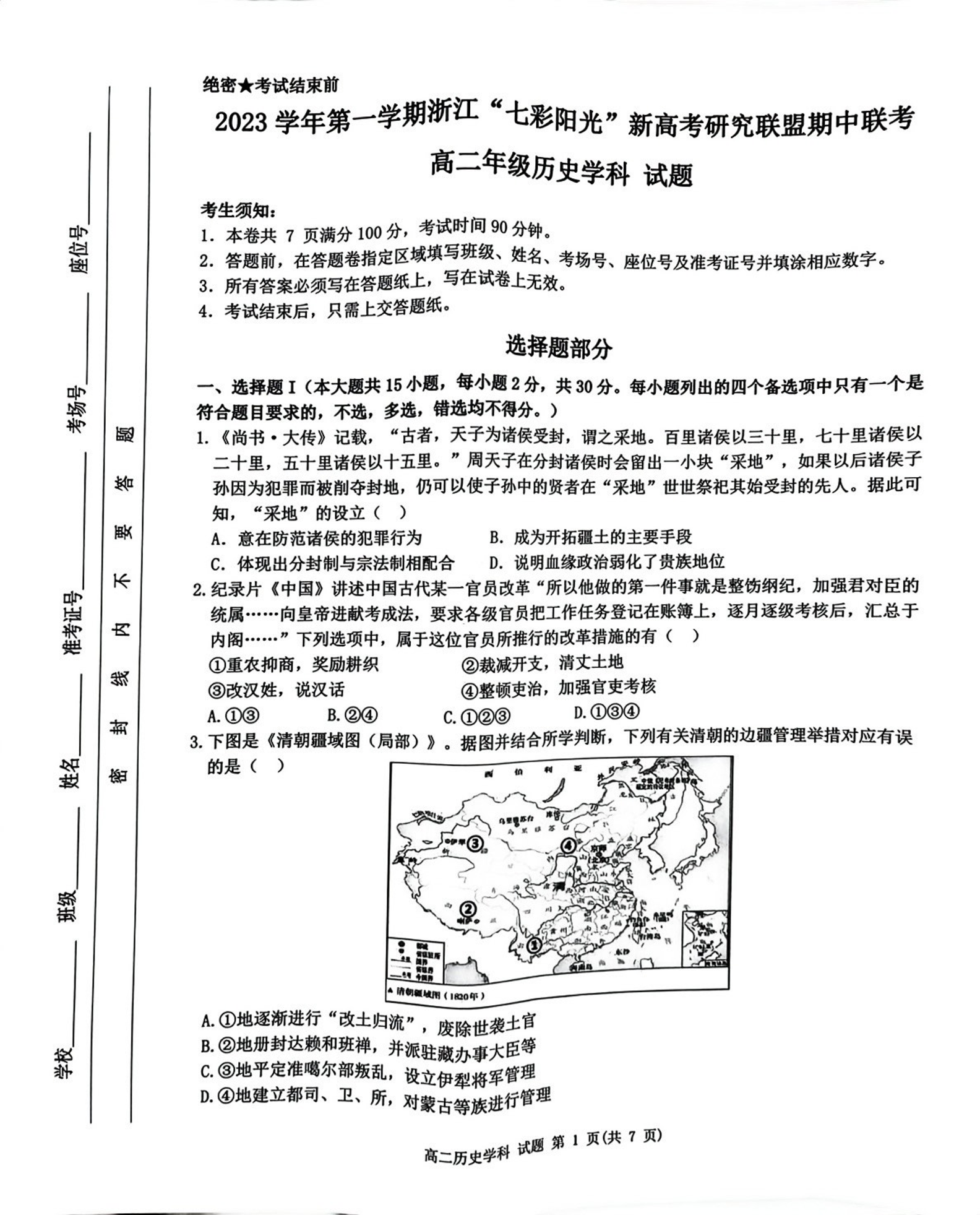浙江省七彩阳光新高考研究联盟2023-2024学年高二上学期11月期中试题历史
