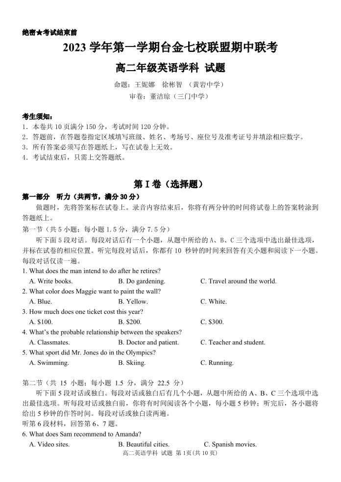 浙江省台金七校联盟2023-2024学年高二上学期期中联考试题英语