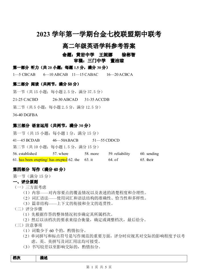 浙江省台金七校联盟2023-2024学年高二上学期期中联考试题英语答案