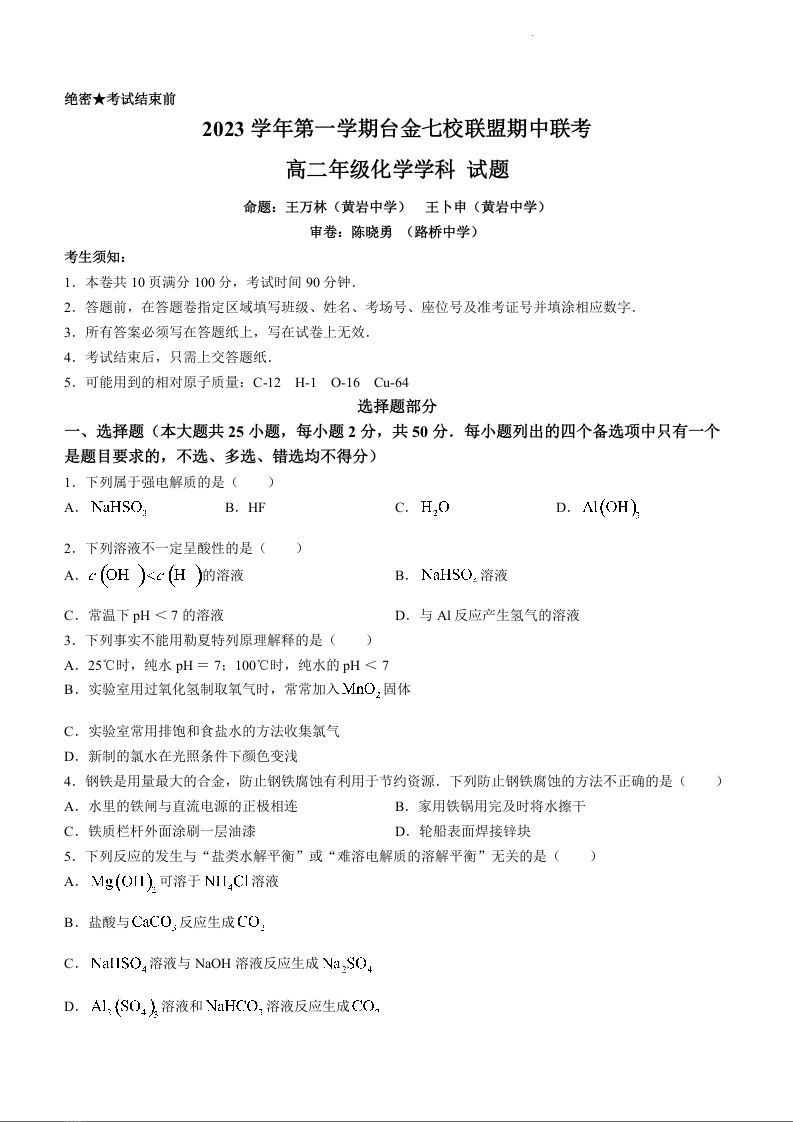 浙江省台金七校联盟2023-2024学年高二上学期期中联考试题化学