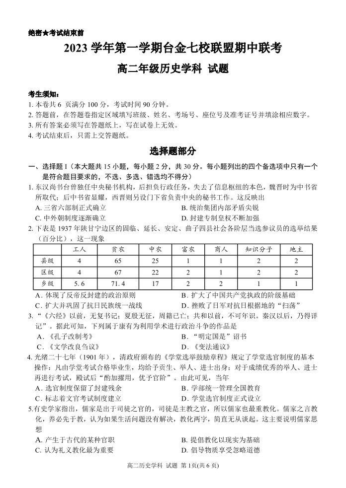 浙江省台金七校联盟2023-2024学年高二上学期期中联考试题历史