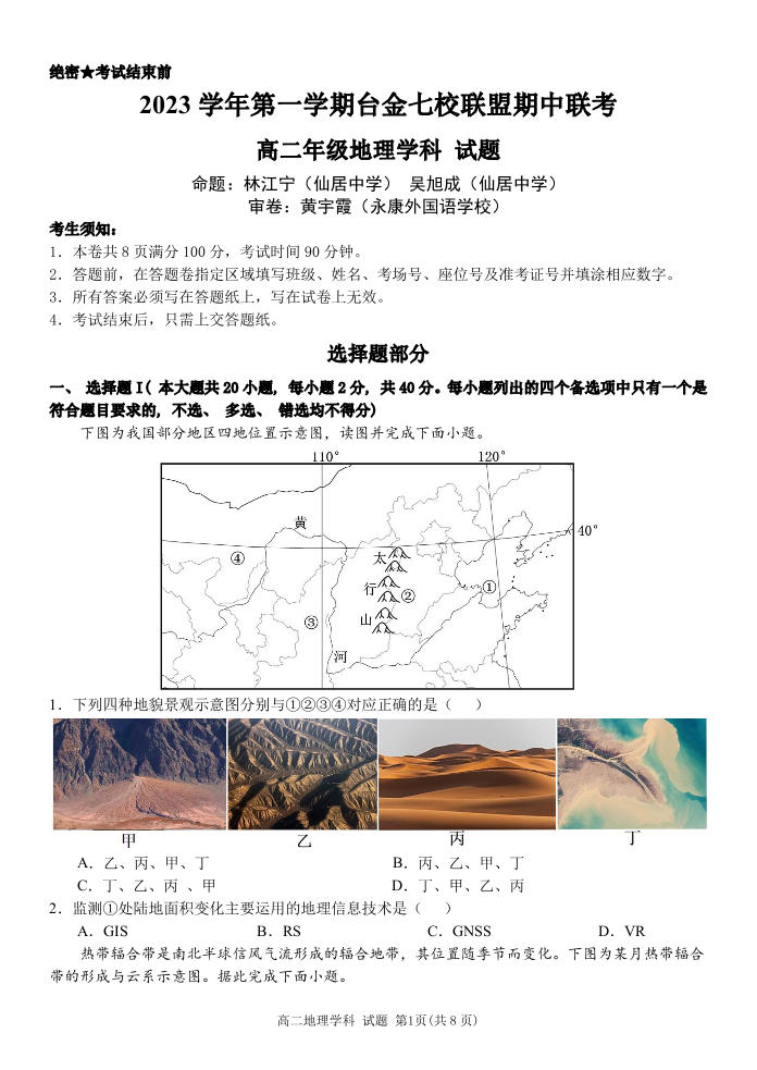 浙江省台金七校联盟2023-2024学年高二上学期期中联考试题地理