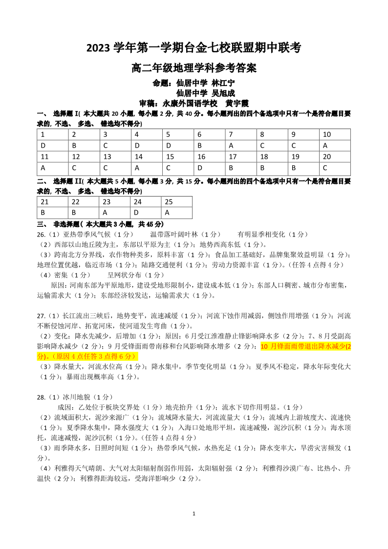 浙江省台金七校联盟2023-2024学年高二上学期期中联考试题地理答案