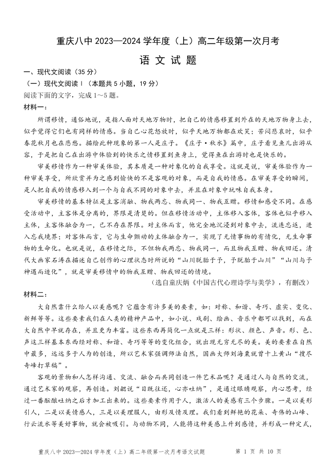 重庆市第八中学校2023-2024学年高二上学期第一次月考试题语文