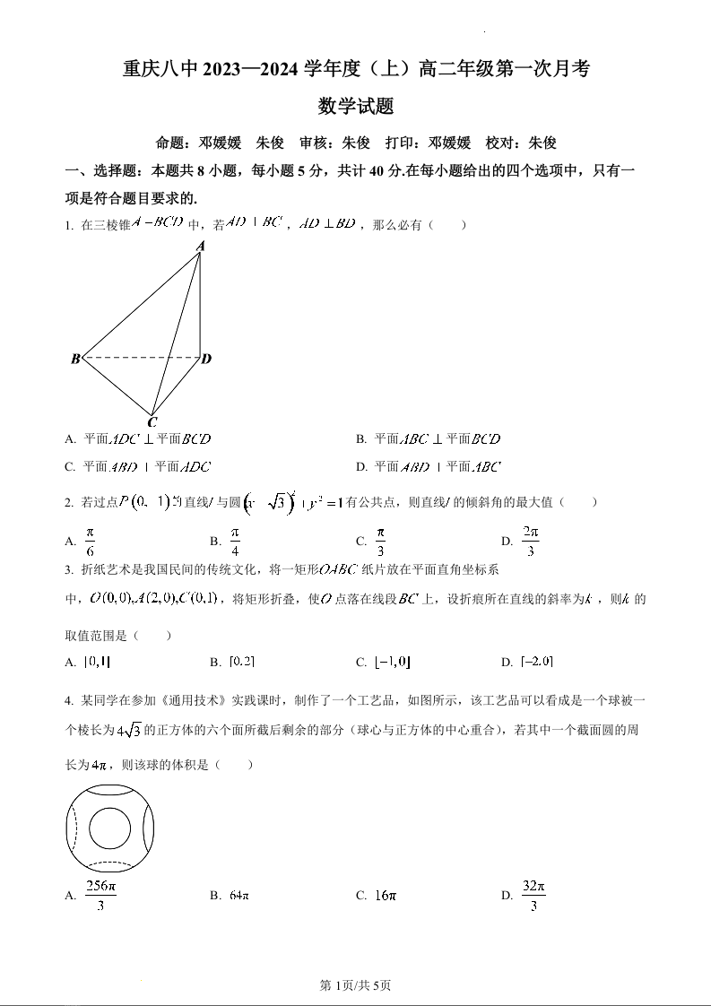 重庆市第八中学校2023-2024学年高二上学期第一次月考试题数学(原卷版)