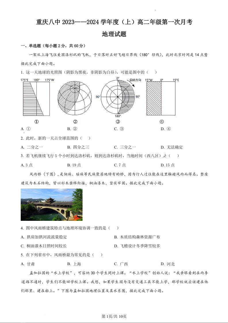 重庆市第八中学校2023-2024学年高二上学期第一次月考试题地理(原卷版)