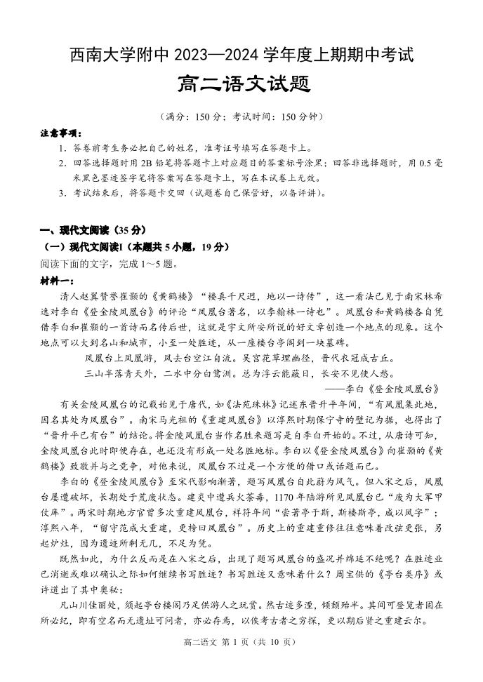 重庆市西南大学附属中学2023-2024学年高二上期期中考试 语文