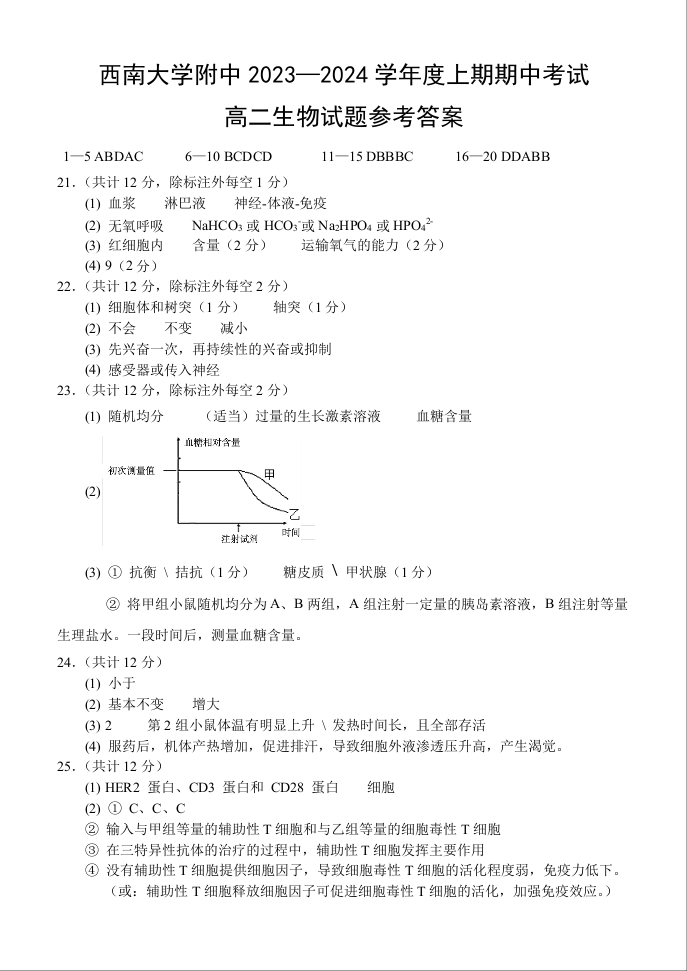 重庆市西南大学附属中学2023-2024学年高二上期期中考试 生物答案