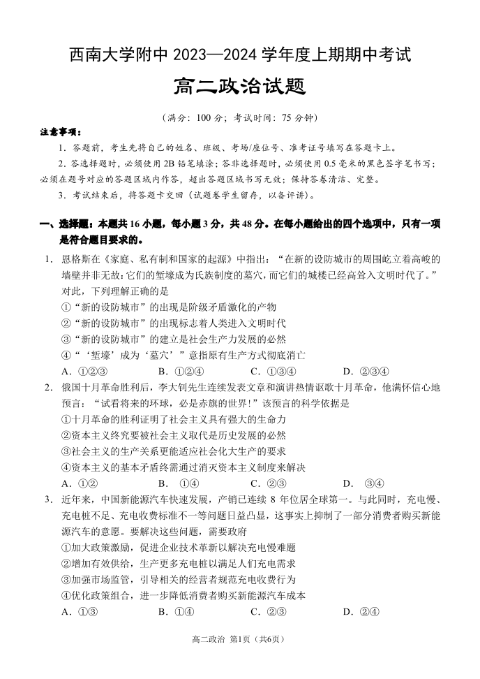重庆市西南大学附属中学2023-2024学年高二上期期中考试 政治