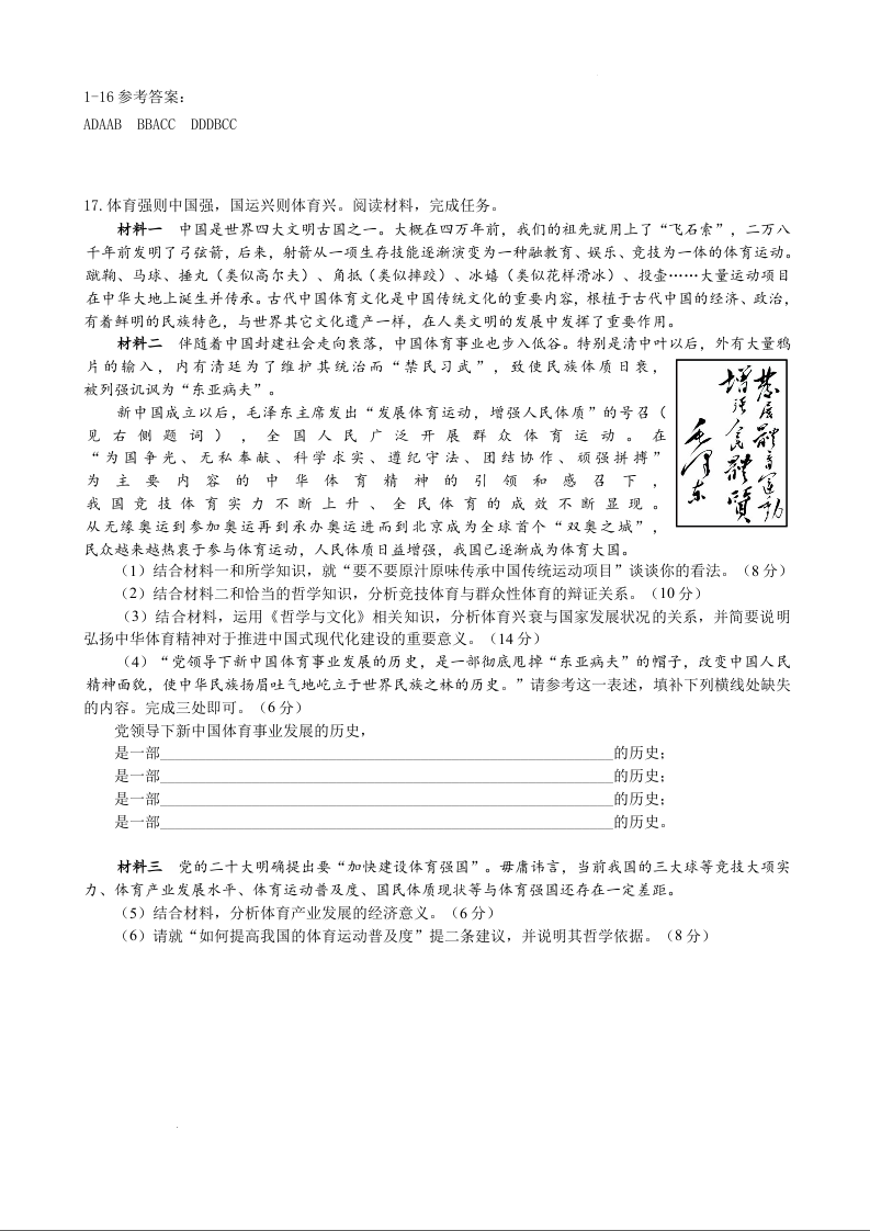 重庆市西南大学附属中学2023-2024学年高二上期期中考试 政治答案