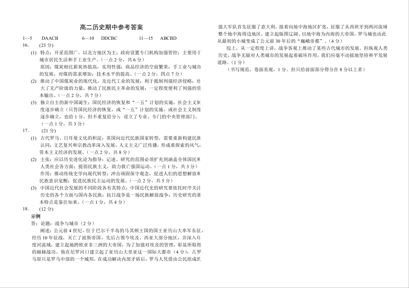 重庆市西南大学附属中学2023-2024学年高二上期期中考试 历史答案