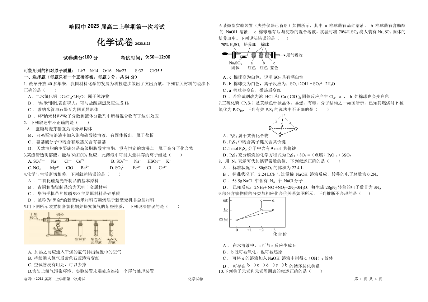 黑龙江省哈尔滨四中2023-2024学年高二上学期第一次考试化学