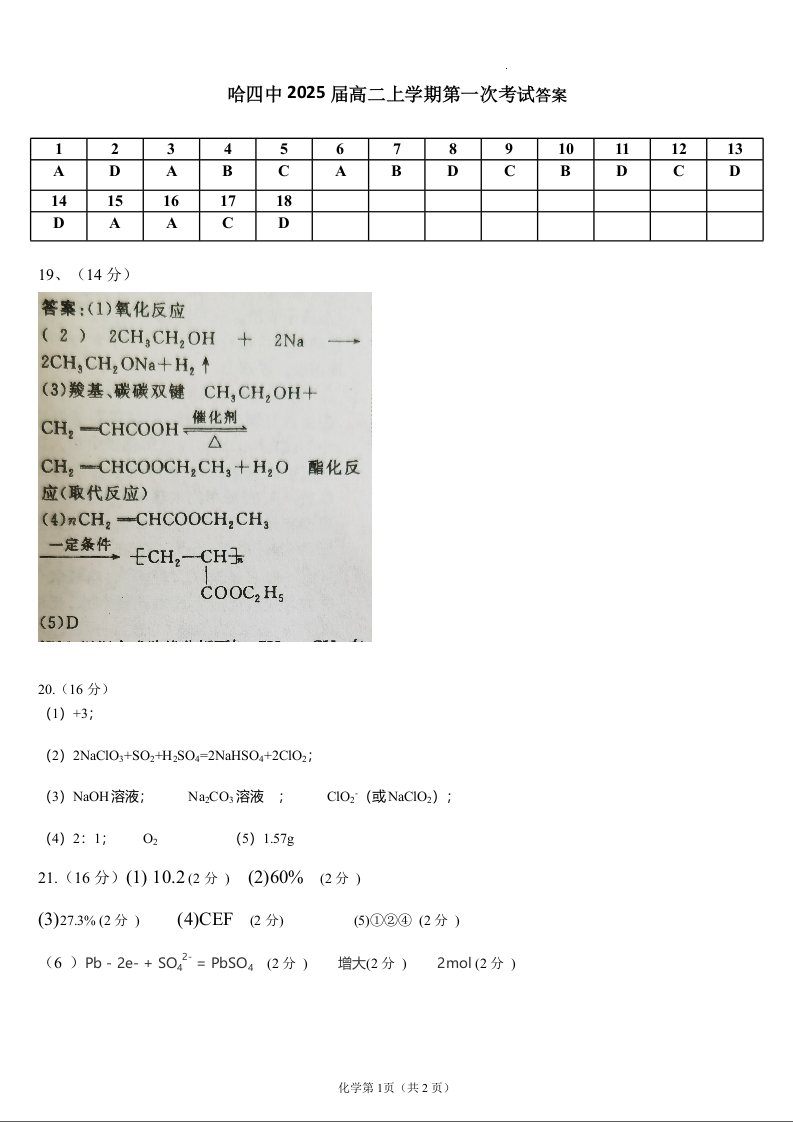 黑龙江省哈尔滨四中2023-2024学年高二上学期第一次考试化学答案