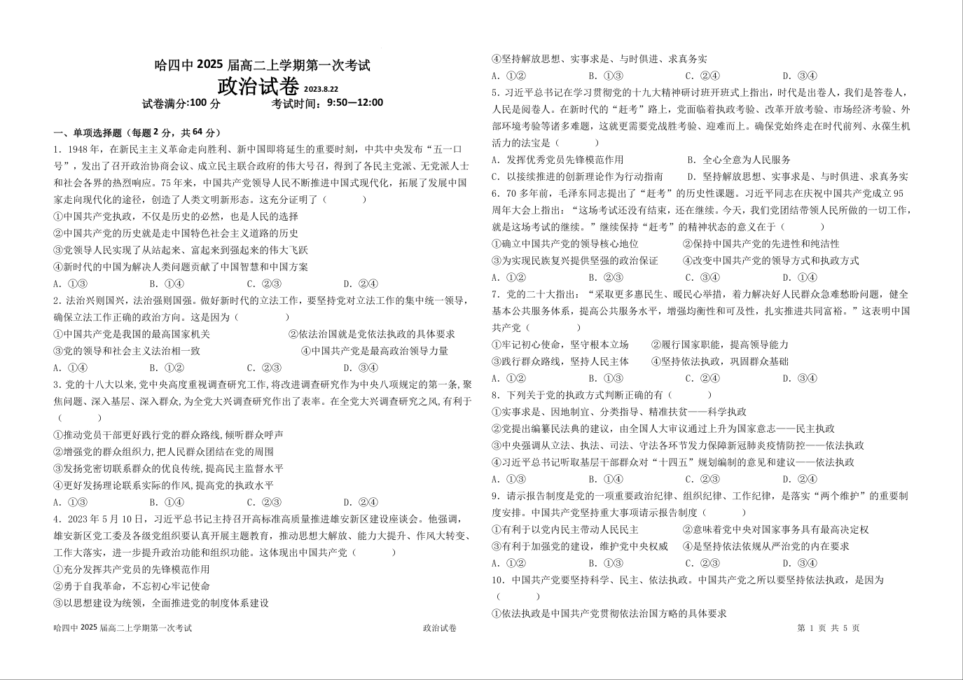 黑龙江省哈尔滨四中2023-2024学年高二上学期第一次考试政治