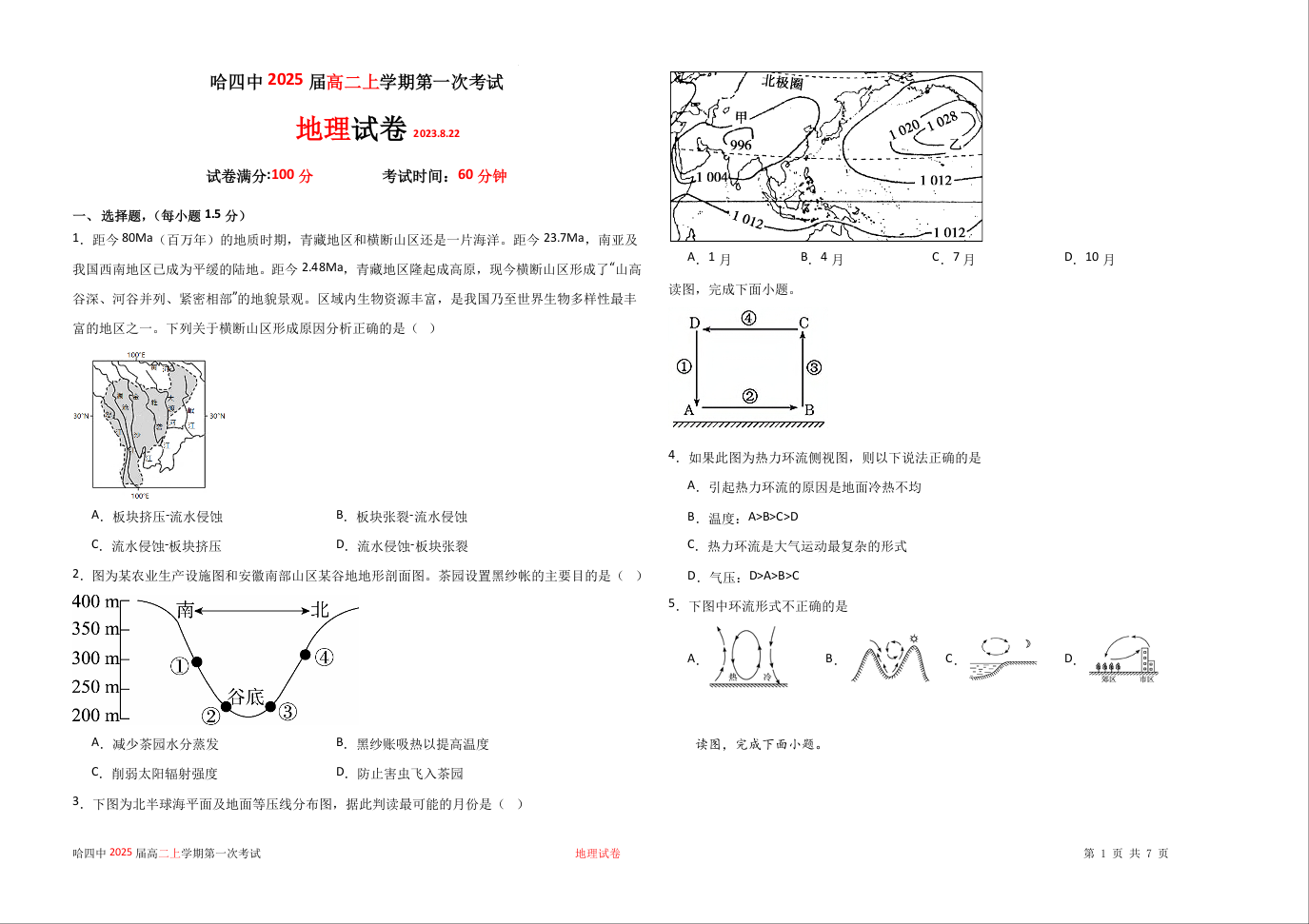 黑龙江省哈尔滨四中2023-2024学年高二上学期第一次考试地理