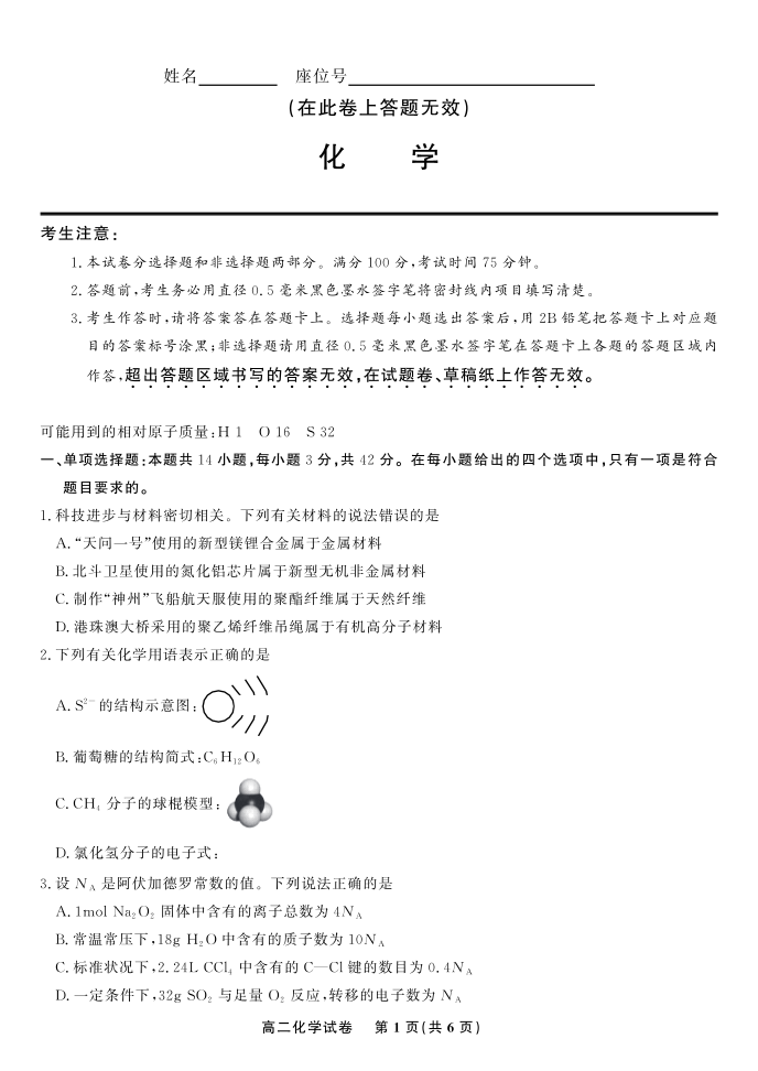 安徽省皖江名校2023-2024学年高二上学期开学联考化学