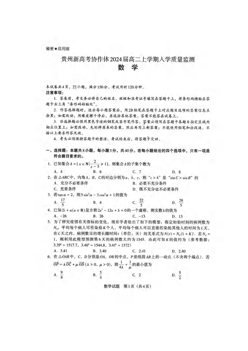 贵州省新高考协作体2024届高二上学期9月质量检测数学+答案