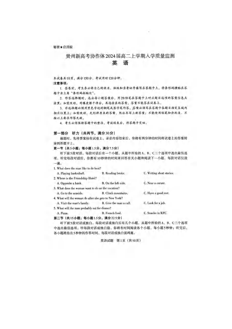 贵州省新高考协作体2024届高二上学期9月质量检测英语+答案