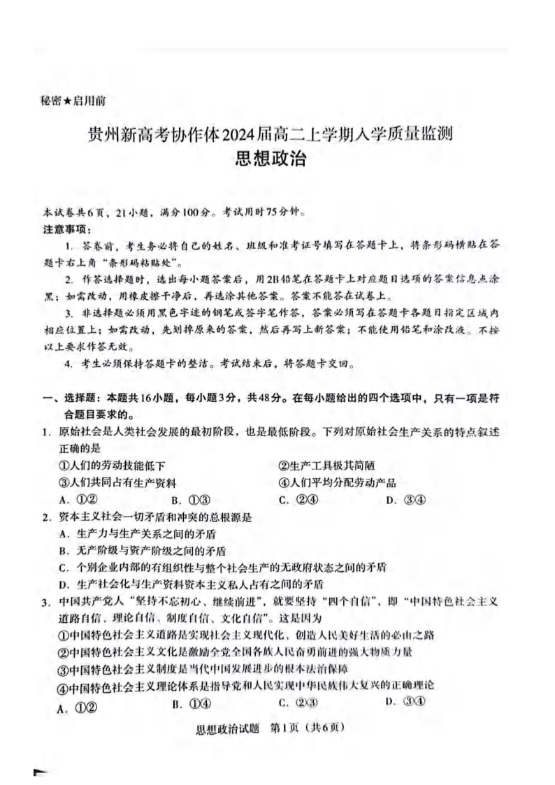 贵州省新高考协作体2024届高二上学期9月质量检测政治+答案