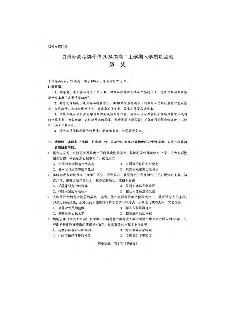 贵州省新高考协作体2024届高二上学期9月质量检测历史+答案