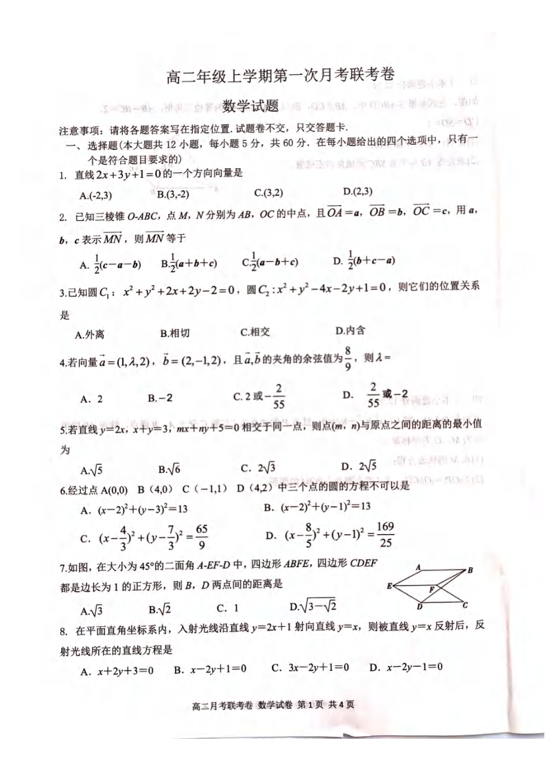 河南省五县联考2024届高二上学期第一次联考数学+答案