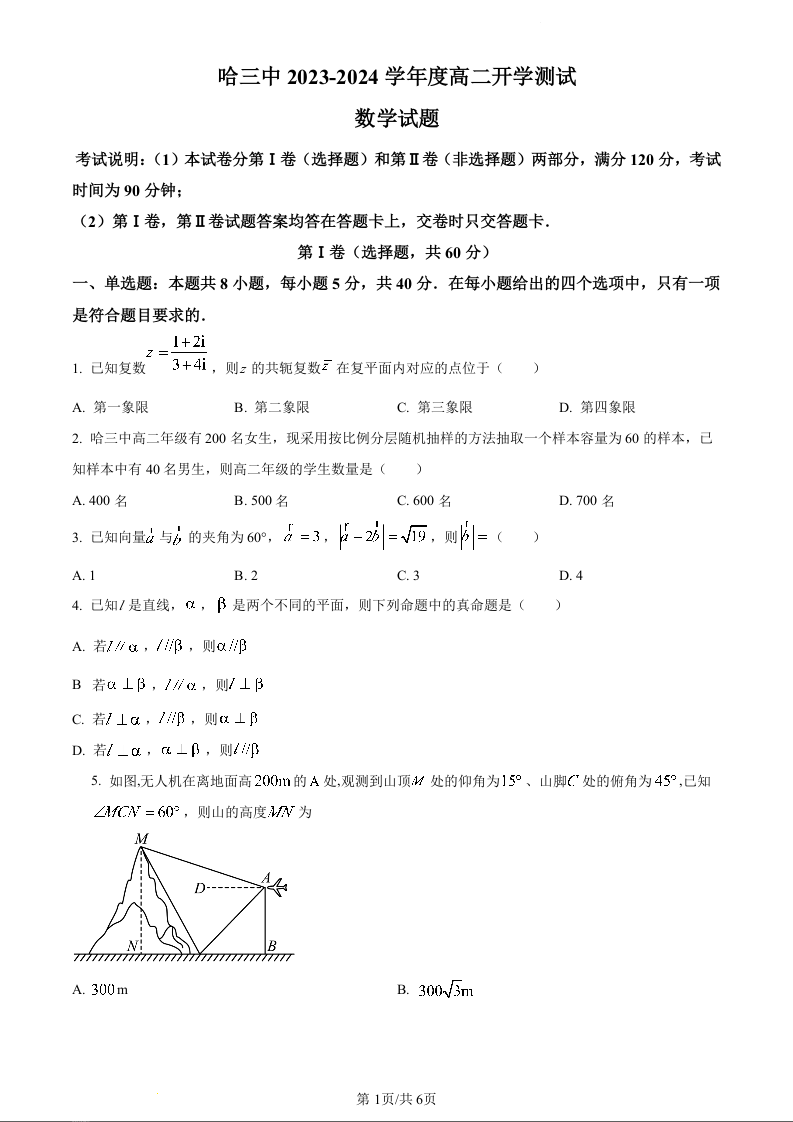 黑龙江省哈尔滨市第三中学校2023-2024学年高二上学期开学测试数学(原卷版)