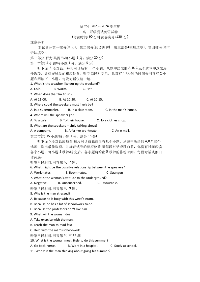 黑龙江省哈尔滨市第三中学校2023-2024学年高二上学期开学测试英语+答案