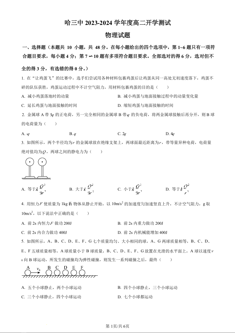 黑龙江省哈尔滨市第三中学校2023-2024学年高二上学期开学测试物理(原卷版)