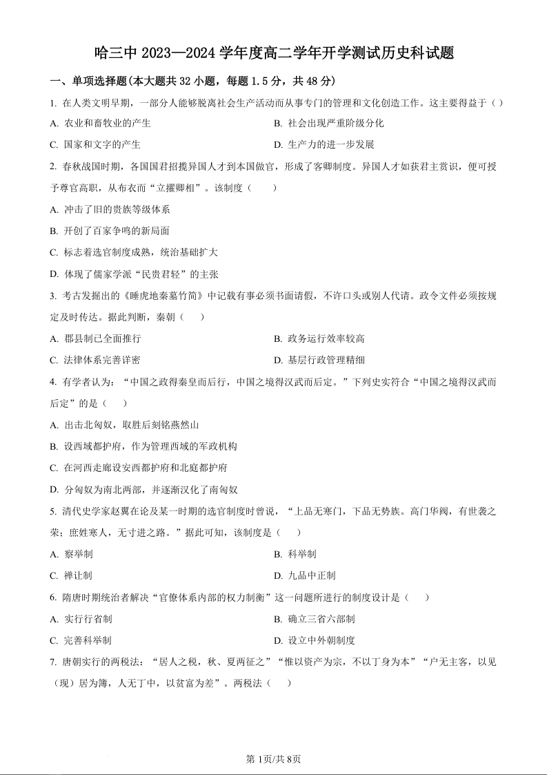 黑龙江省哈尔滨市第三中学校2023-2024学年高二上学期开学测试历史(原卷版)