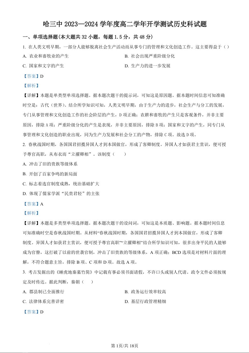 黑龙江省哈尔滨市第三中学校2023-2024学年高二上学期开学测试历史(精品解析版)