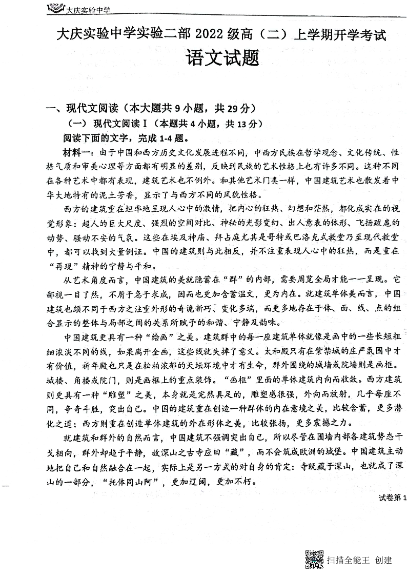 黑龙江省大庆实验中学二部2023-2024学年高二上学期开学考试语文