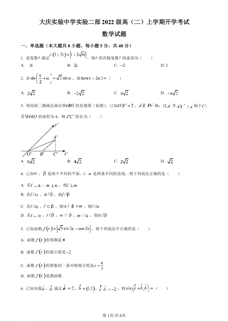 黑龙江省大庆实验中学二部2023-2024学年高二上学期开学考试数学(原卷版)