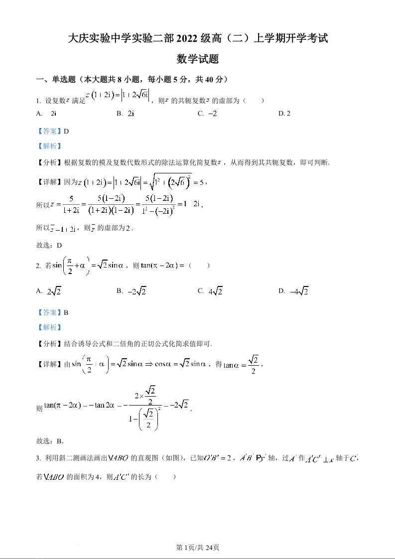 黑龙江省大庆实验中学二部2023-2024学年高二上学期开学考试数学(精品解析版)