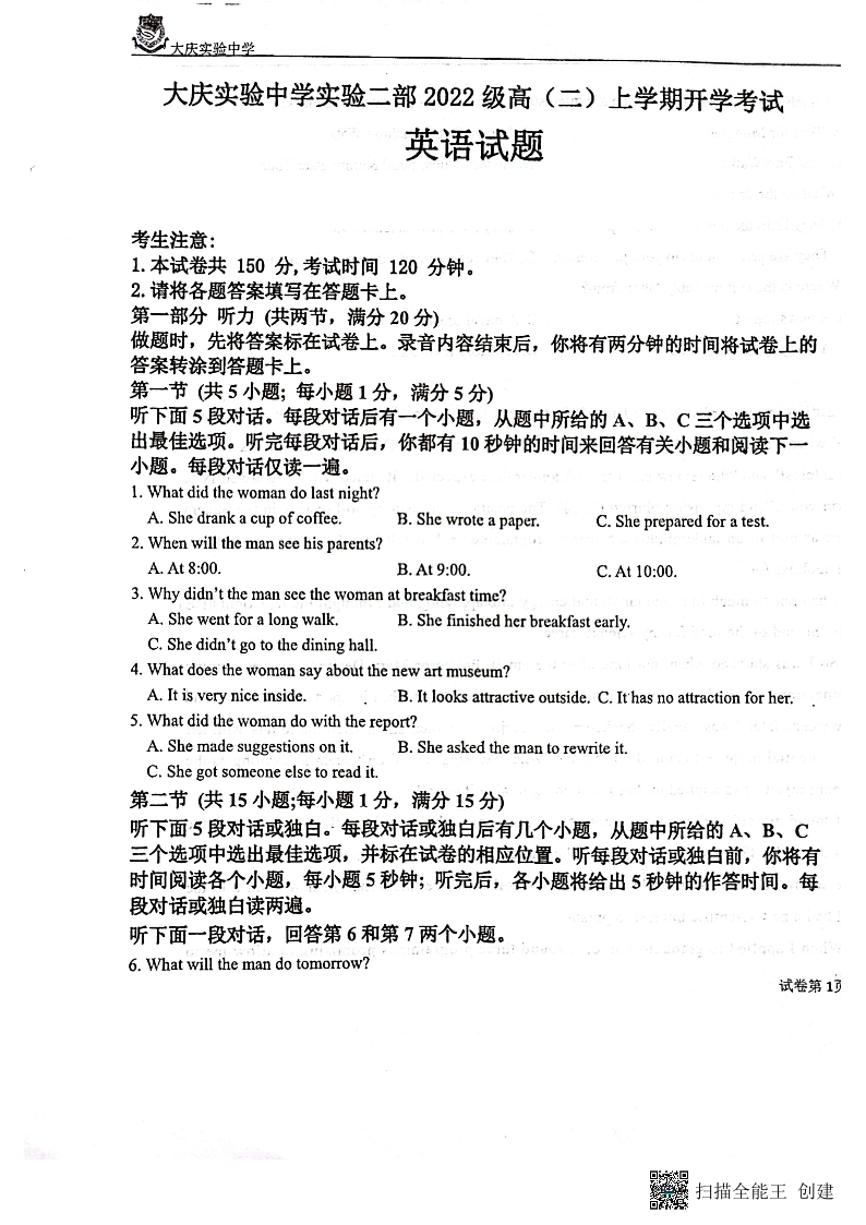 黑龙江省大庆实验中学二部2023-2024学年高二上学期开学考试英语