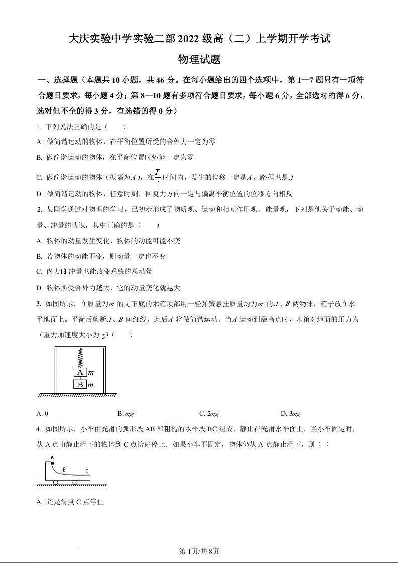 黑龙江省大庆实验中学二部2023-2024学年高二上学期开学考试物理(原卷版)