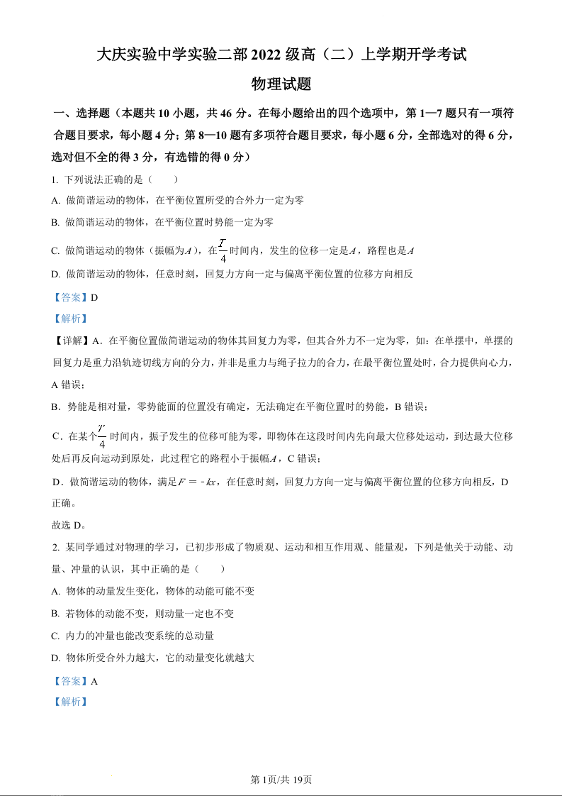 黑龙江省大庆实验中学二部2023-2024学年高二上学期开学考试物理(精品解析版)
