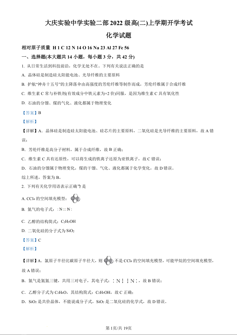 黑龙江省大庆实验中学二部2023-2024学年高二上学期开学考试化学(精品解析版)