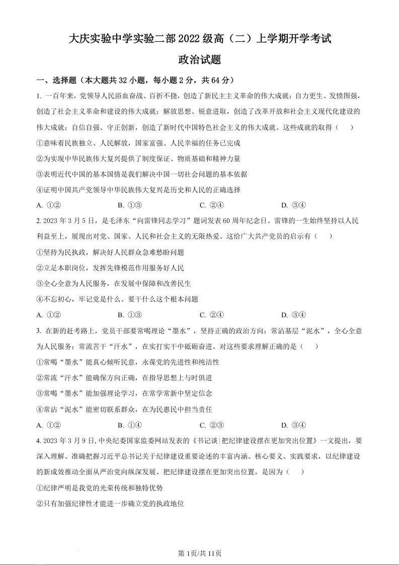 黑龙江省大庆实验中学二部2023-2024学年高二上学期开学考试政治(原卷版)
