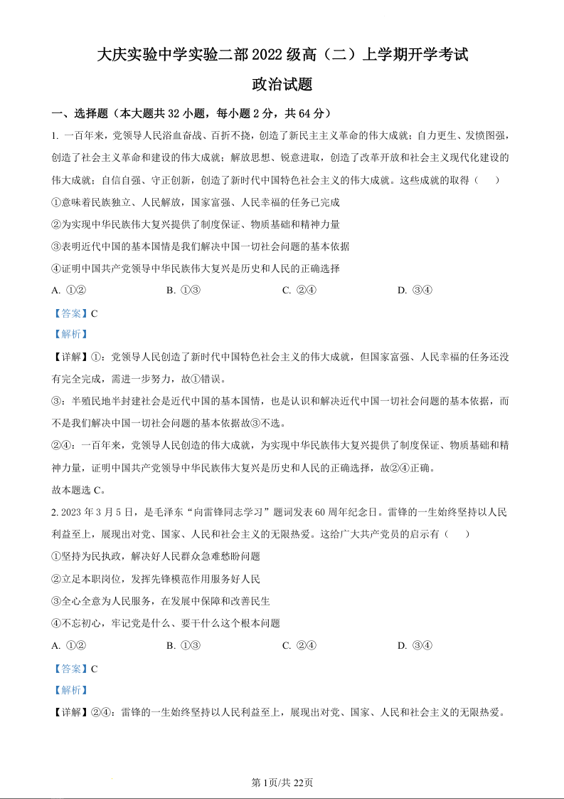 黑龙江省大庆实验中学二部2023-2024学年高二上学期开学考试政治(精品解析版)