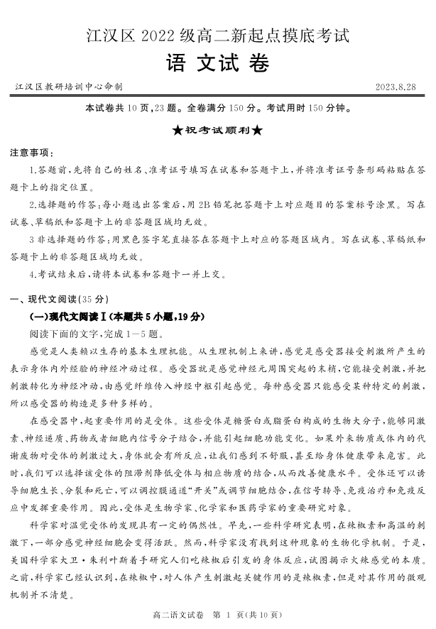 湖北省武汉市江汉区2023-2024学年高二上学期新起点摸底考试语文