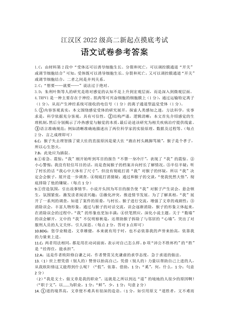 湖北省武汉市江汉区2023-2024学年高二上学期新起点摸底考试语文答案