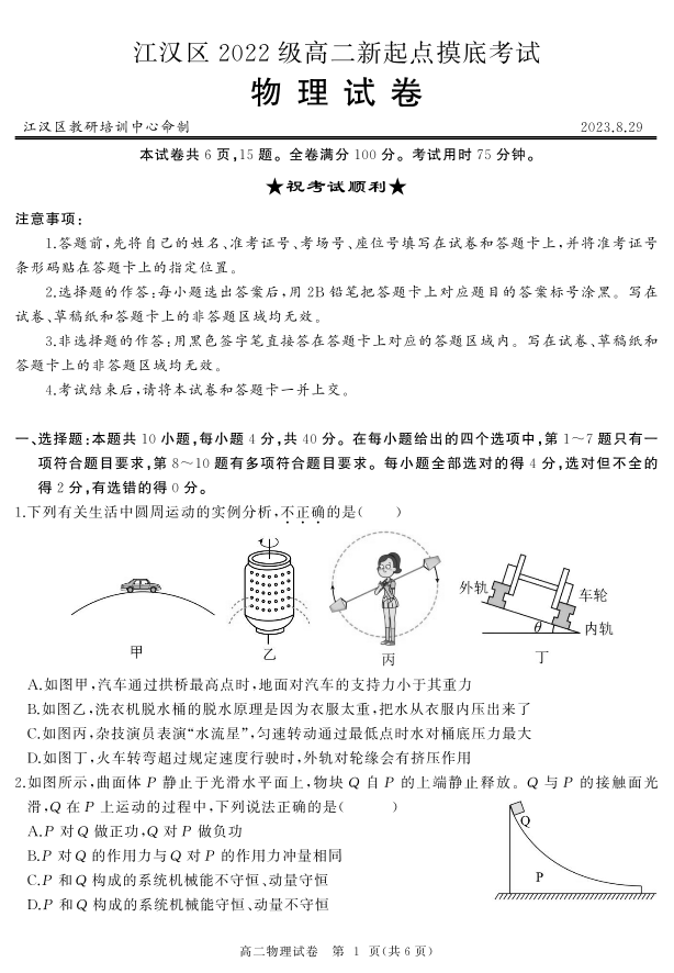 湖北省武汉市江汉区2023-2024学年高二上学期新起点摸底考试物理