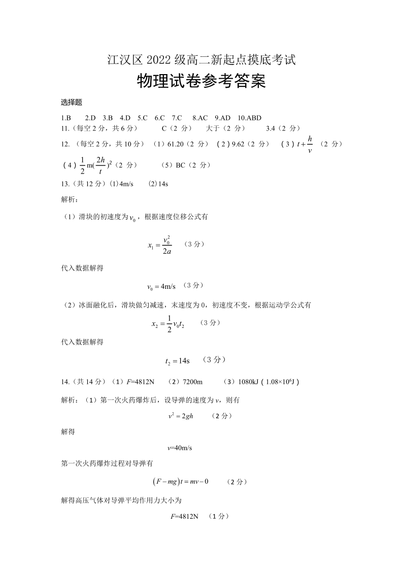 湖北省武汉市江汉区2023-2024学年高二上学期新起点摸底考试物理答案