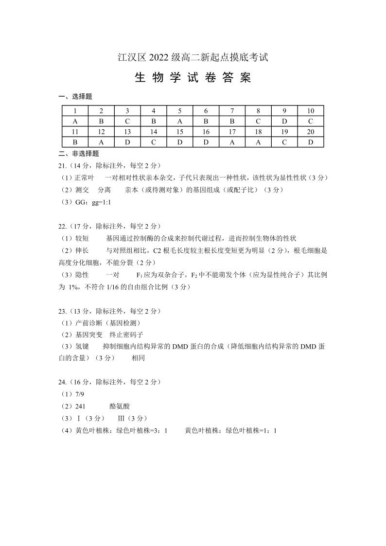湖北省武汉市江汉区2023-2024学年高二上学期新起点摸底考试生物答案