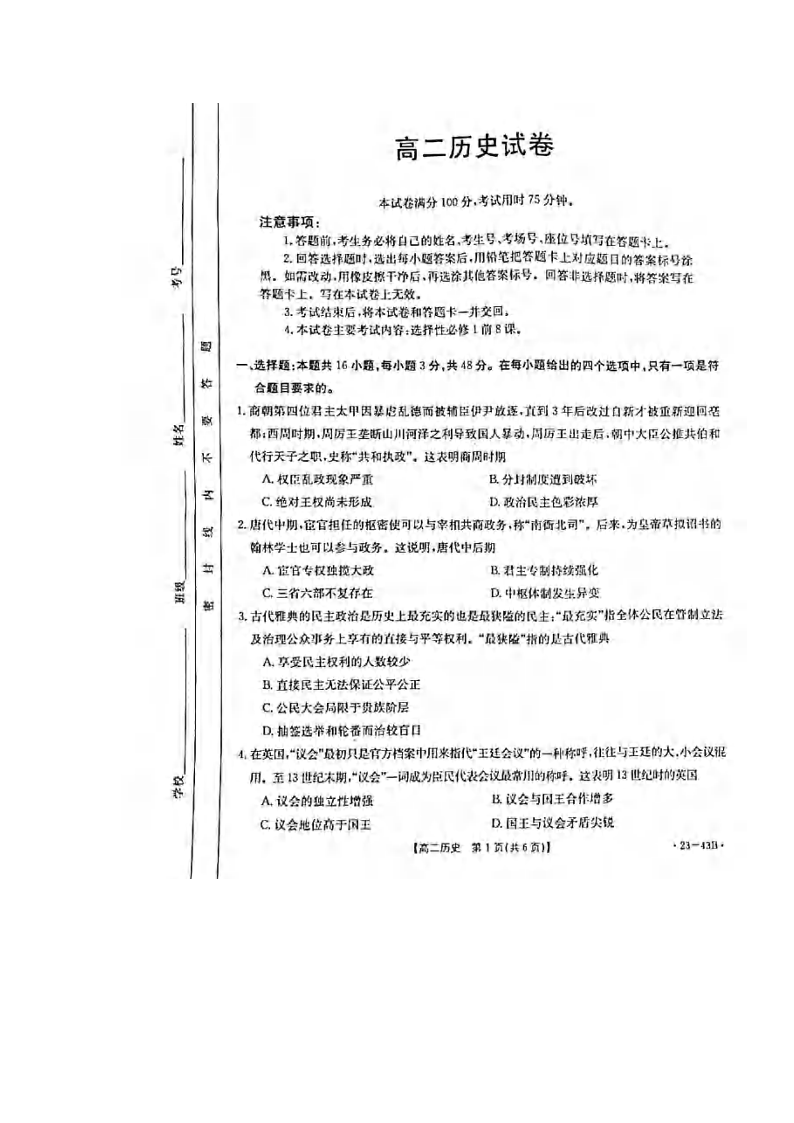 湖北省孝感市2024届高二上学期9月联考历史+答案
