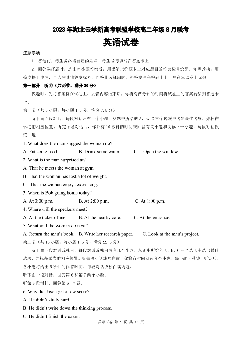 湖北省云学新高考联盟学校2023-2024学年高二上学期8月开学联考英语+答案