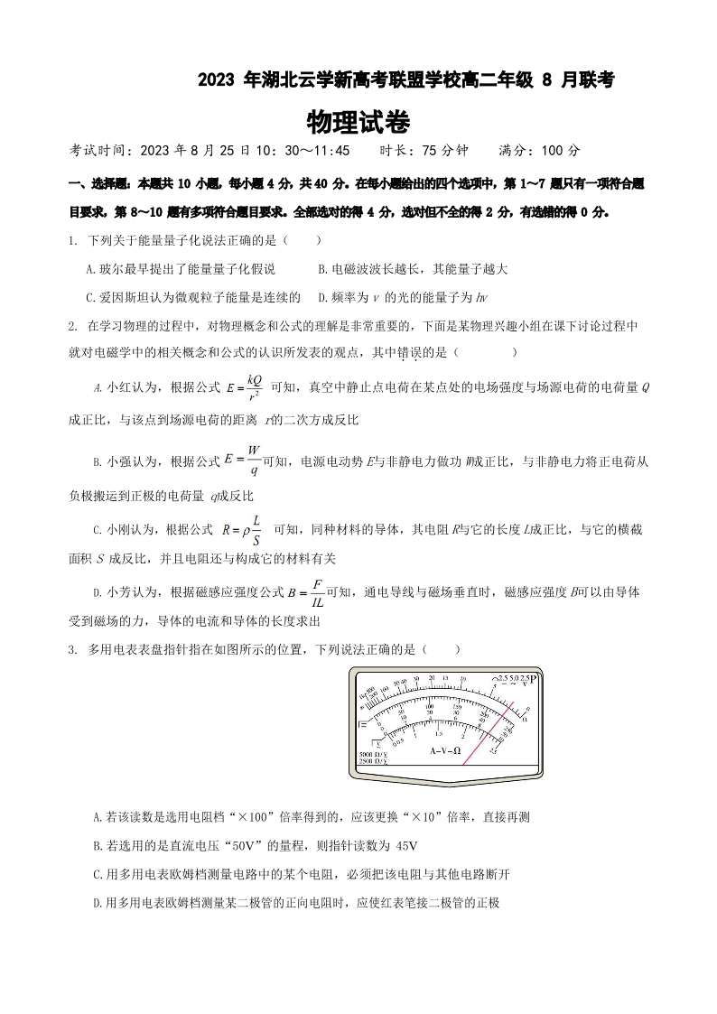 湖北省云学新高考联盟学校2023-2024学年高二上学期8月开学联考物理+答案