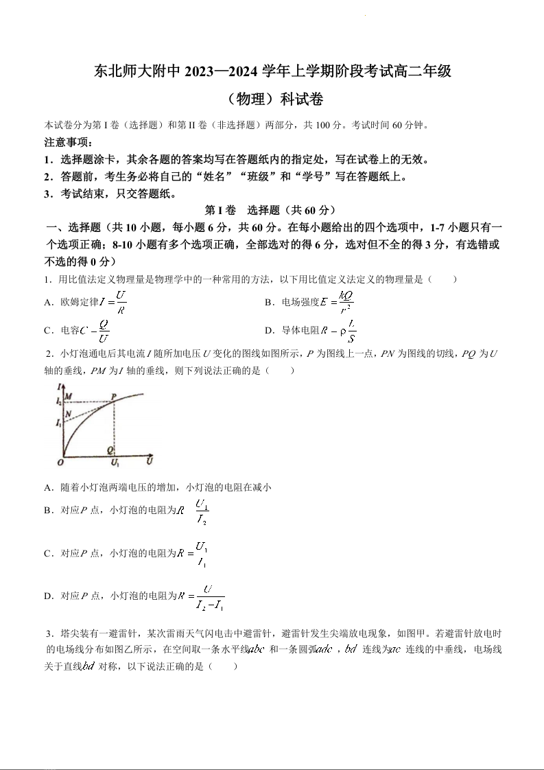 吉林省长春市东北师范大学附属中学2023-2024学年高二上学期第一次月考物理
