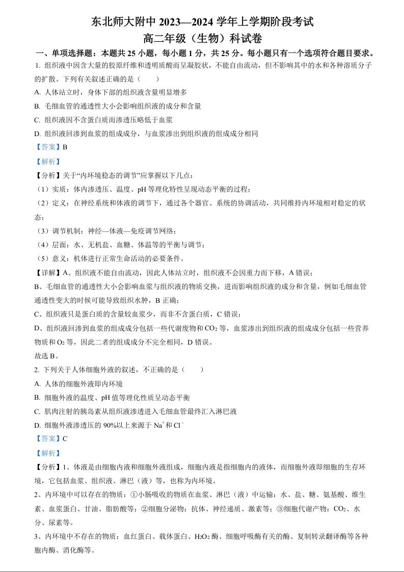 吉林省长春市东北师范大学附属中学2023-2024学年高二上学期第一次月考生物(精品解析版)