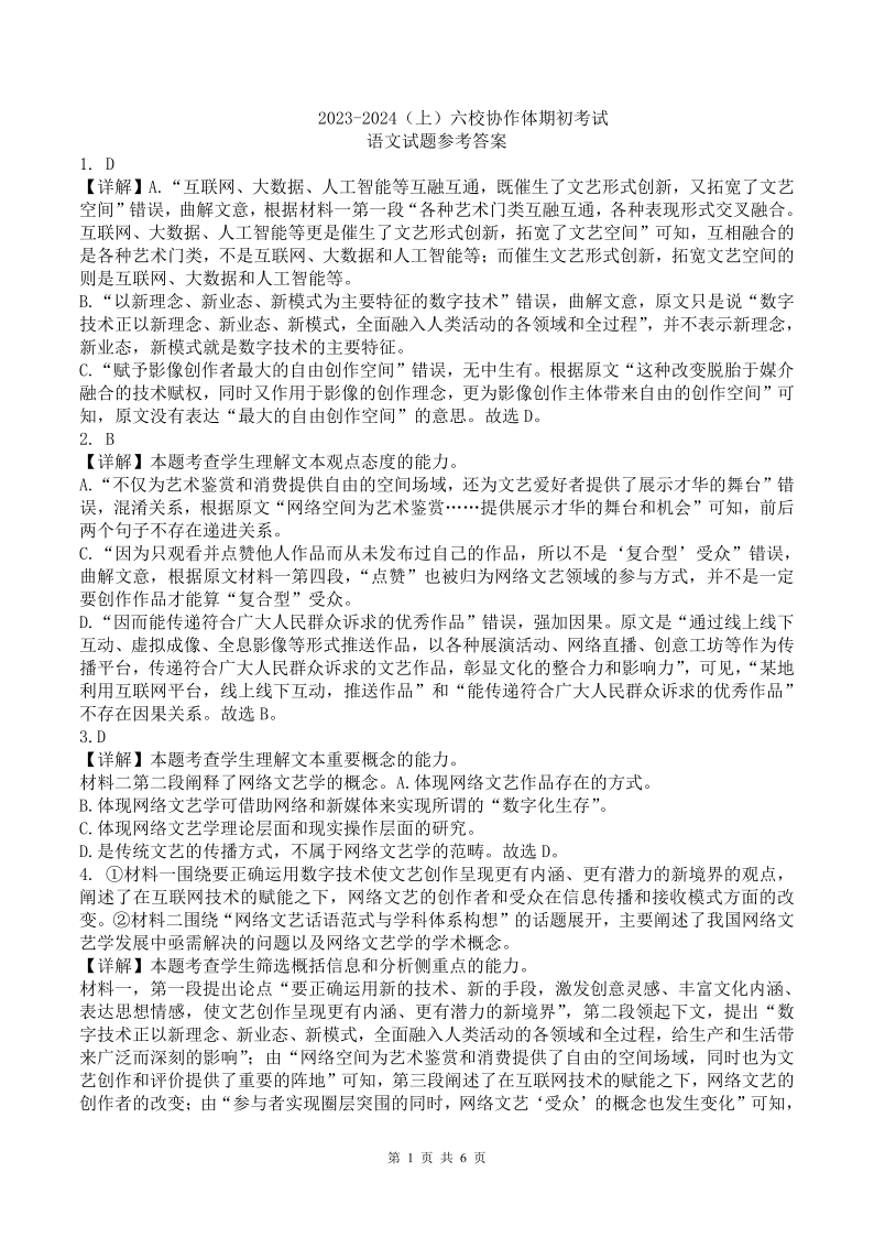 辽宁省六校协作体2023-2024学年高二上学期开学考试语文答案